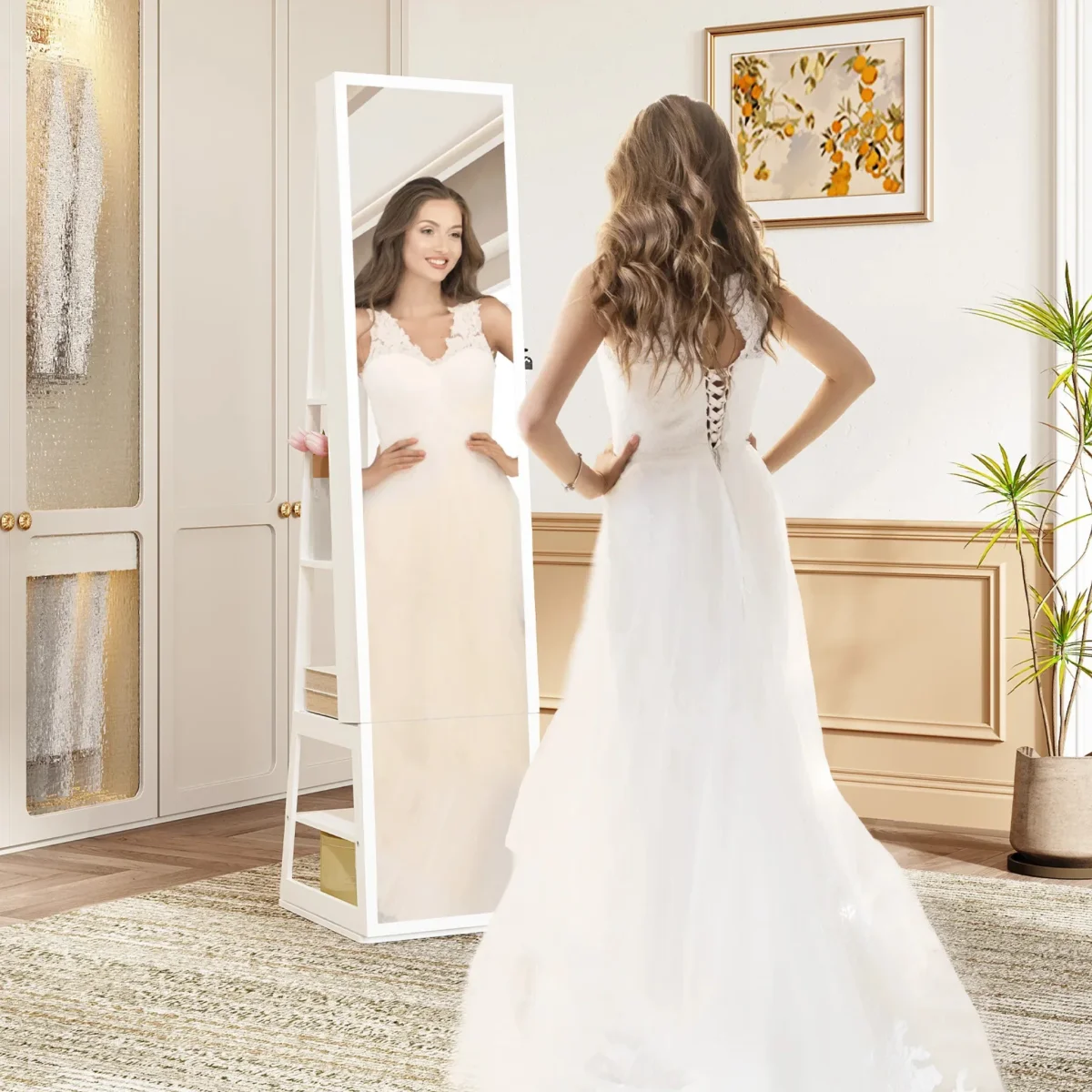 Sculptée dans des lignes sobres et modernes, elle s’intègre harmonieusement à toute coiffeuse ou chambre élégante. Le miroir plein pied rotatif à 360° dévoile votre silhouette en un geste, tandis que sa base stable optimise votre espace, sans jamais l’encombrer.