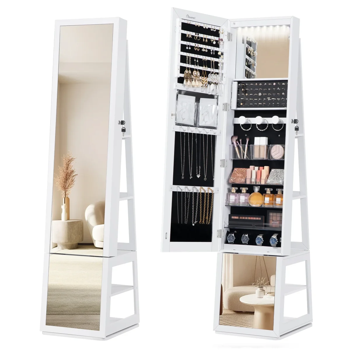 Armoire à bijoux avec miroir rotatif et rangements intégrés