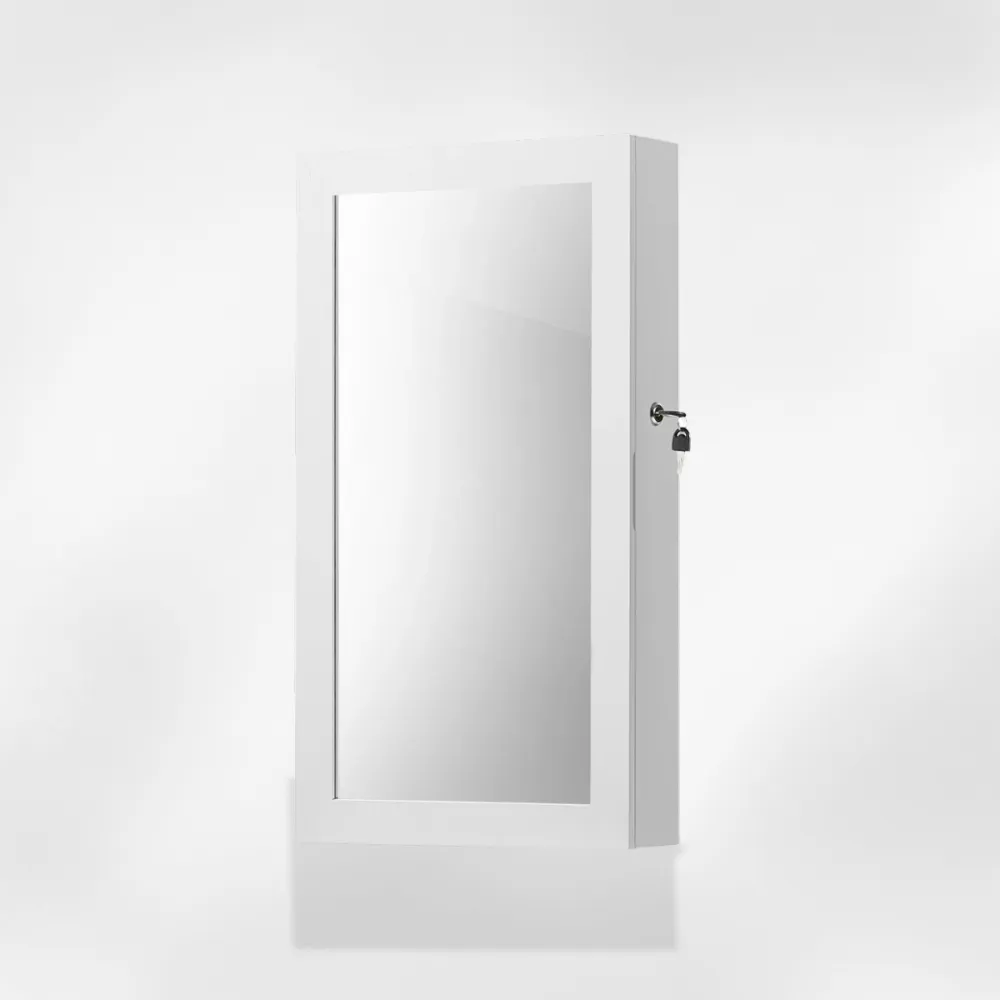 Le miroir intégré facilite vos essayages et le système de verrouillage sécurise vos pièces précieuses. Gain de place garanti dans votre chambre ou dressing, cette solution murale libère vos surfaces tout en gardant vos parures à portée de main.