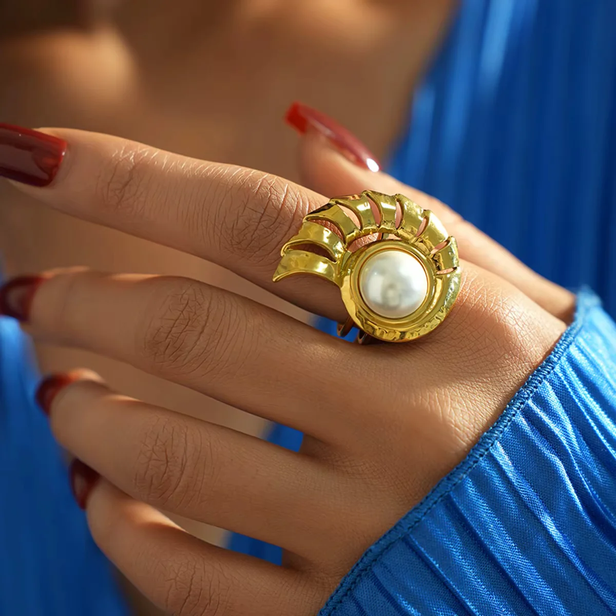 Bague Coquillage Conque Incrusté sur le doigt d'une femme