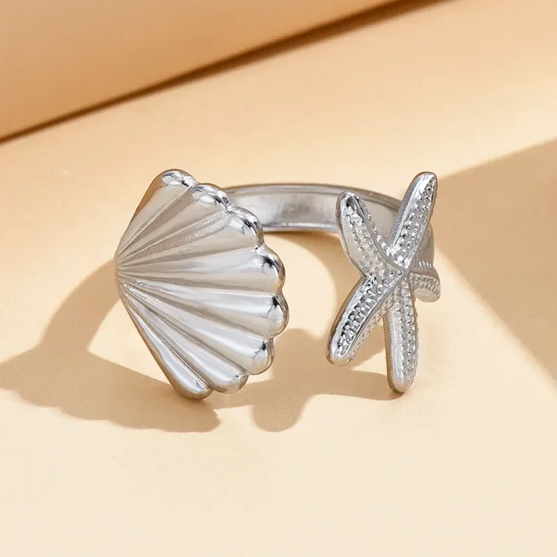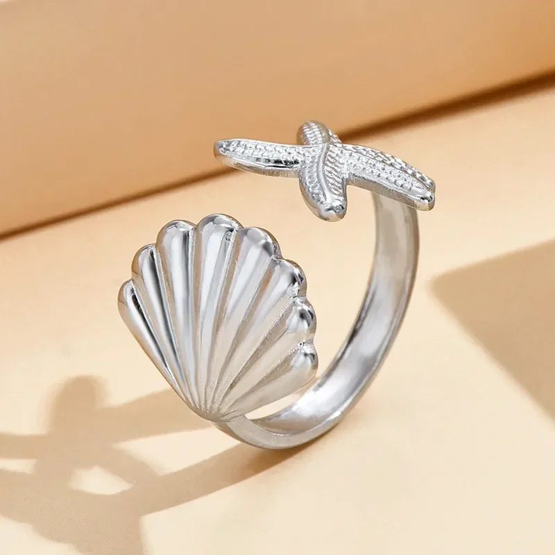 Bague Coquillage Saint-Jacques et Étoile de Mer ajustable Argentée