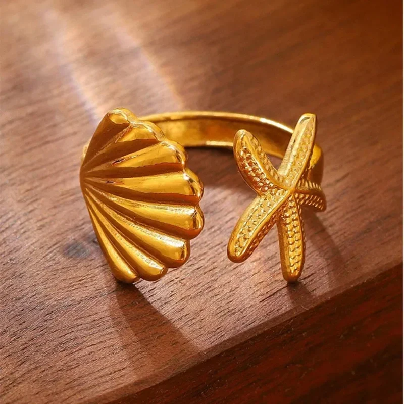 Bague Coquillage Saint-Jacques et Étoile de Mer ajustable dorée