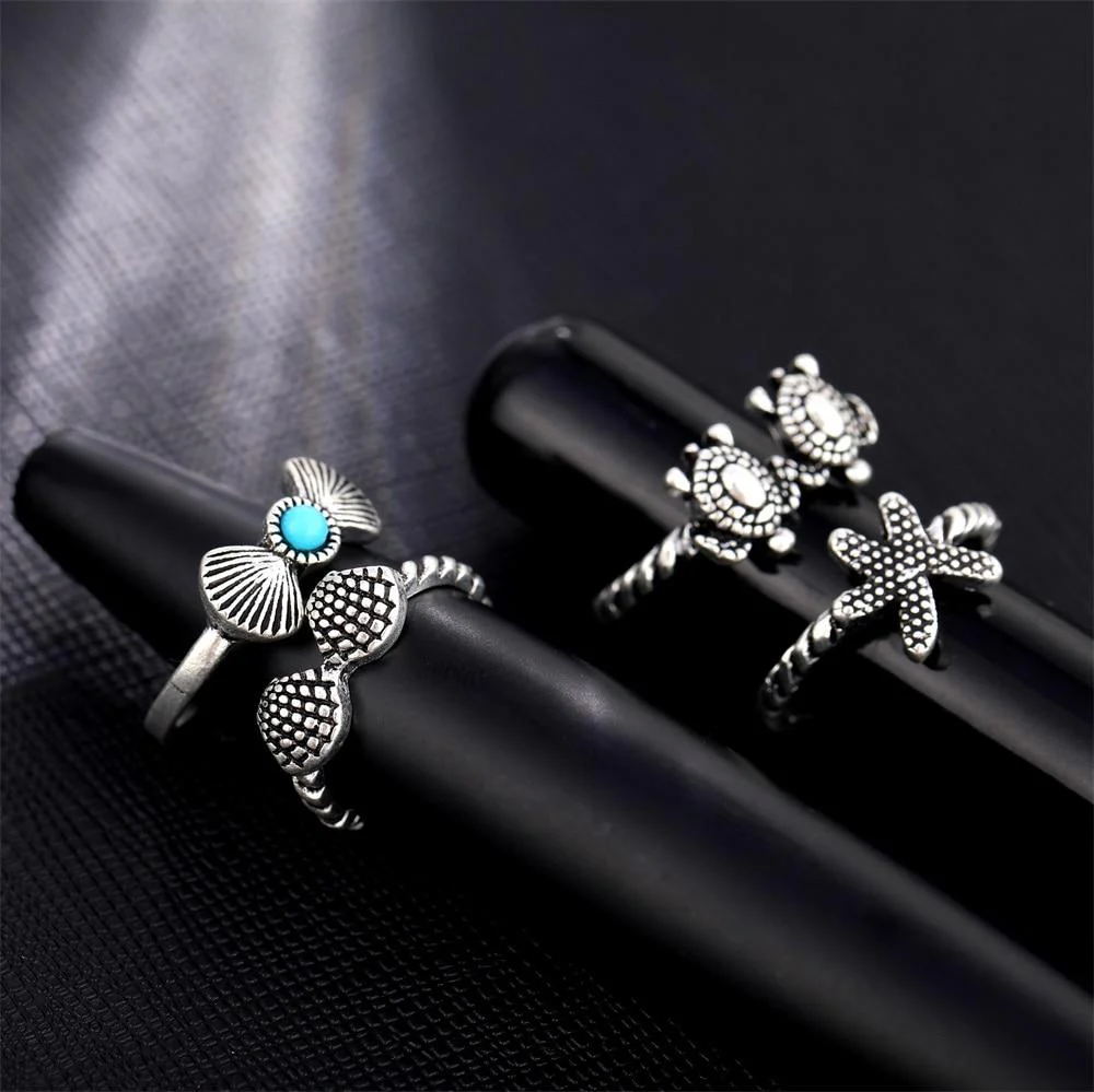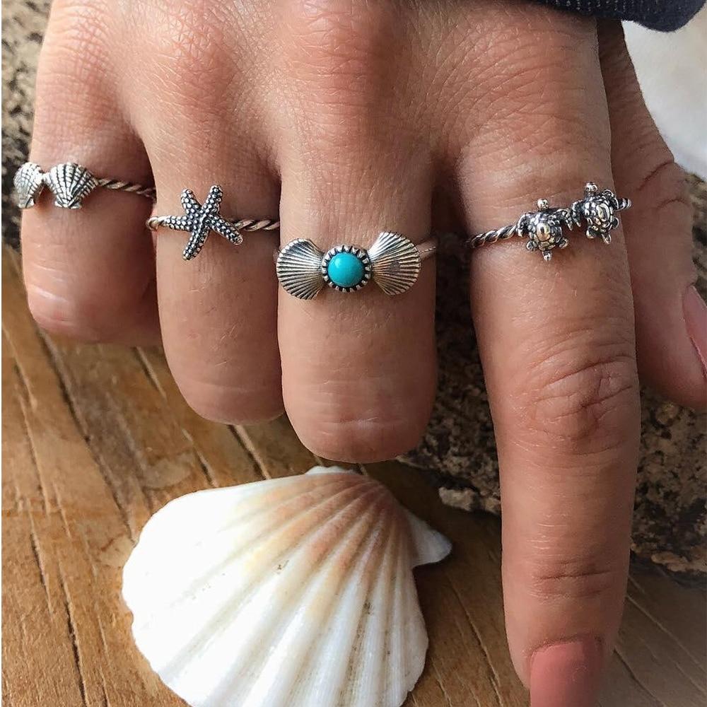 Laissez place à l’océan qui sommeille en vous en portant cette bague océan au doigt de votre choix ! Composée de divers anneaux (étoile de mer, tortues, Saint-Jacques et perles), elle pourrait compléter votre tenue à merveille. Vous pourriez accompagner cette bague en coquillage d’un vernis à ongles bleu et d’un t-shirt uni. Laissez vous séduire par la tendance du bijou coquillage marin !