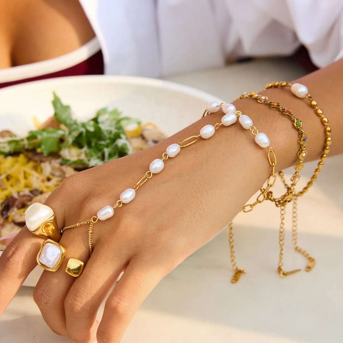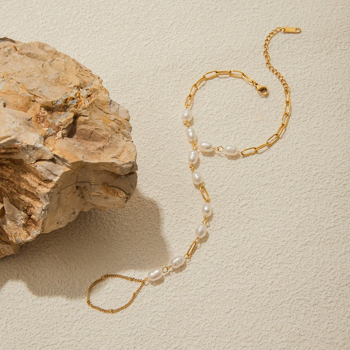 Les perles, aux formes irrégulières, apportent une beauté authentique et vivante, contrastant merveilleusement avec l’éclat chaleureux de l’or. Ce bracelet de main est pensé pour magnifier vos gestes et attirer le regard, qu’il s’agisse d’une sortie en journée ou d’un dîner plus habillé. Son fermoir réglable assure un ajustement parfait pour un confort absolu.