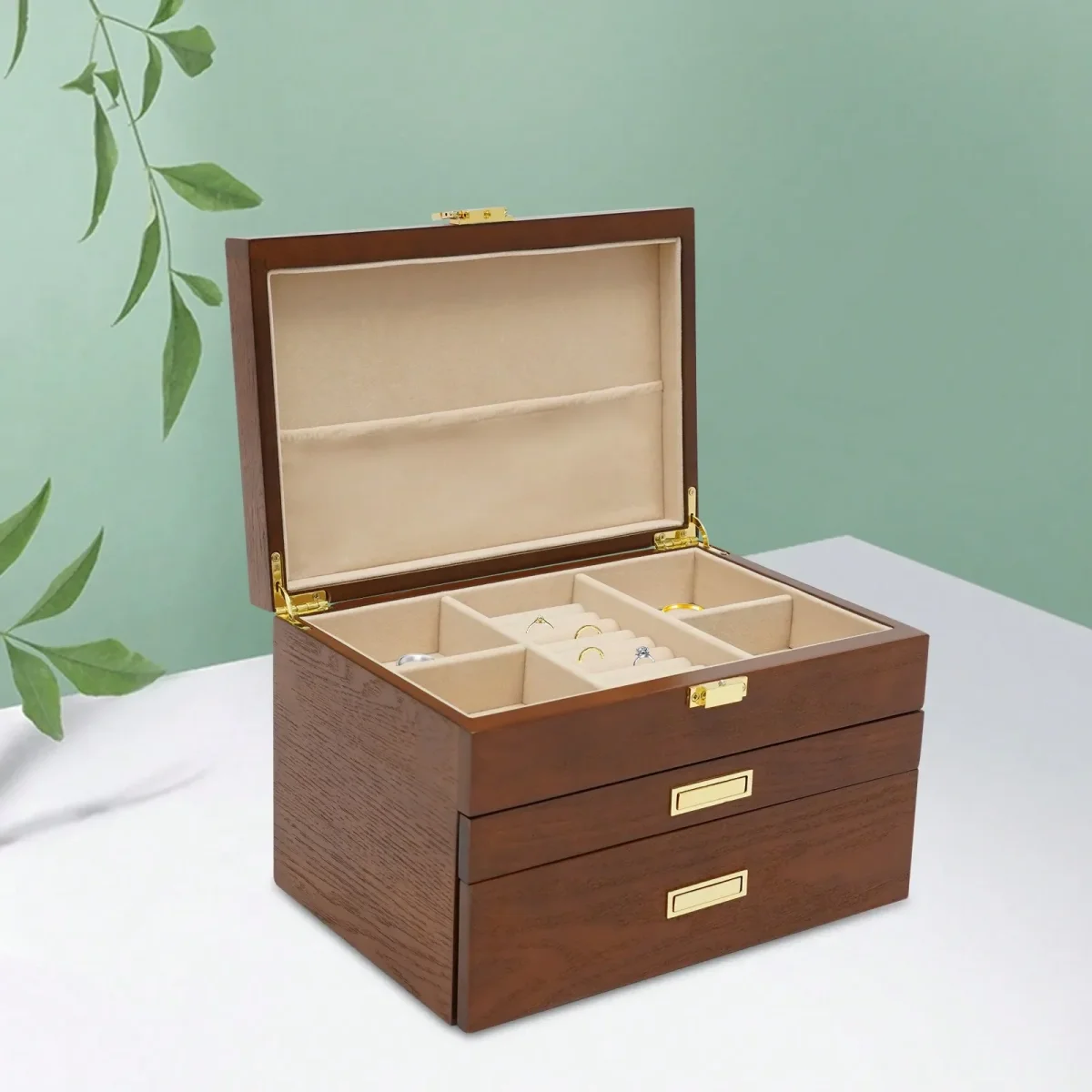 Fabriquée à partir de bois dense soigneusement travaillé, ornée de détails métalliques dorés, cette boîte respire la durabilité. L’intérieur en velours doux protège vos bijoux les plus précieux avec douceur et sécurité.