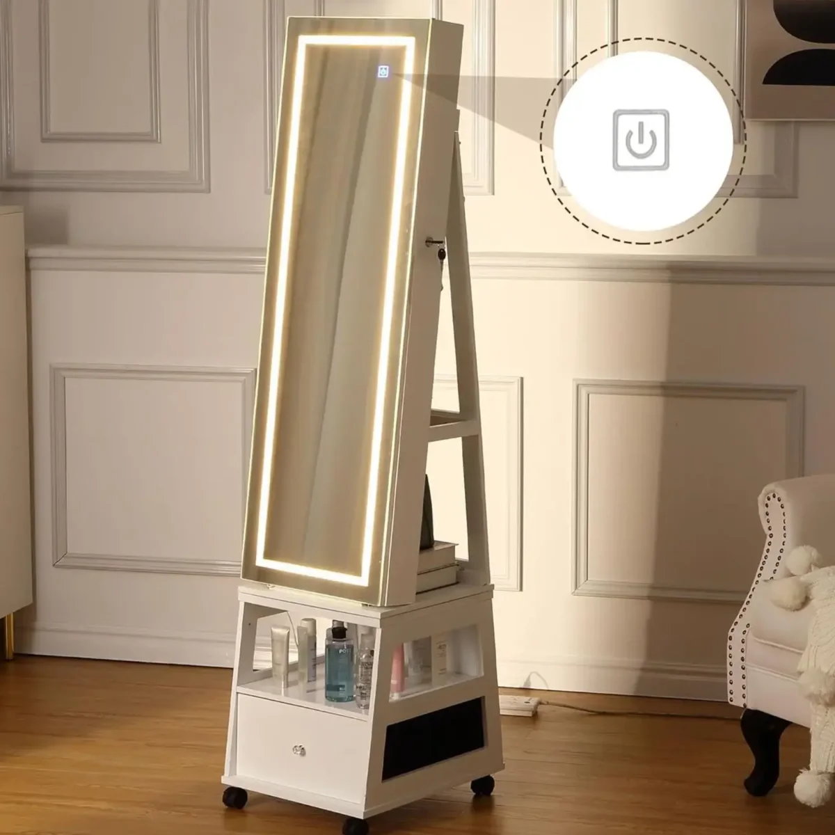 Écrin sur roulettes, miroir HD et rangements généreux pour un quotidien fluide.