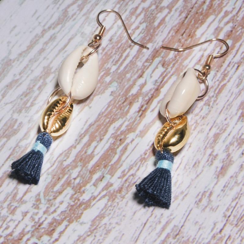 Boucles d’oreilles cauri coquillage porcelaine et pompon bleu