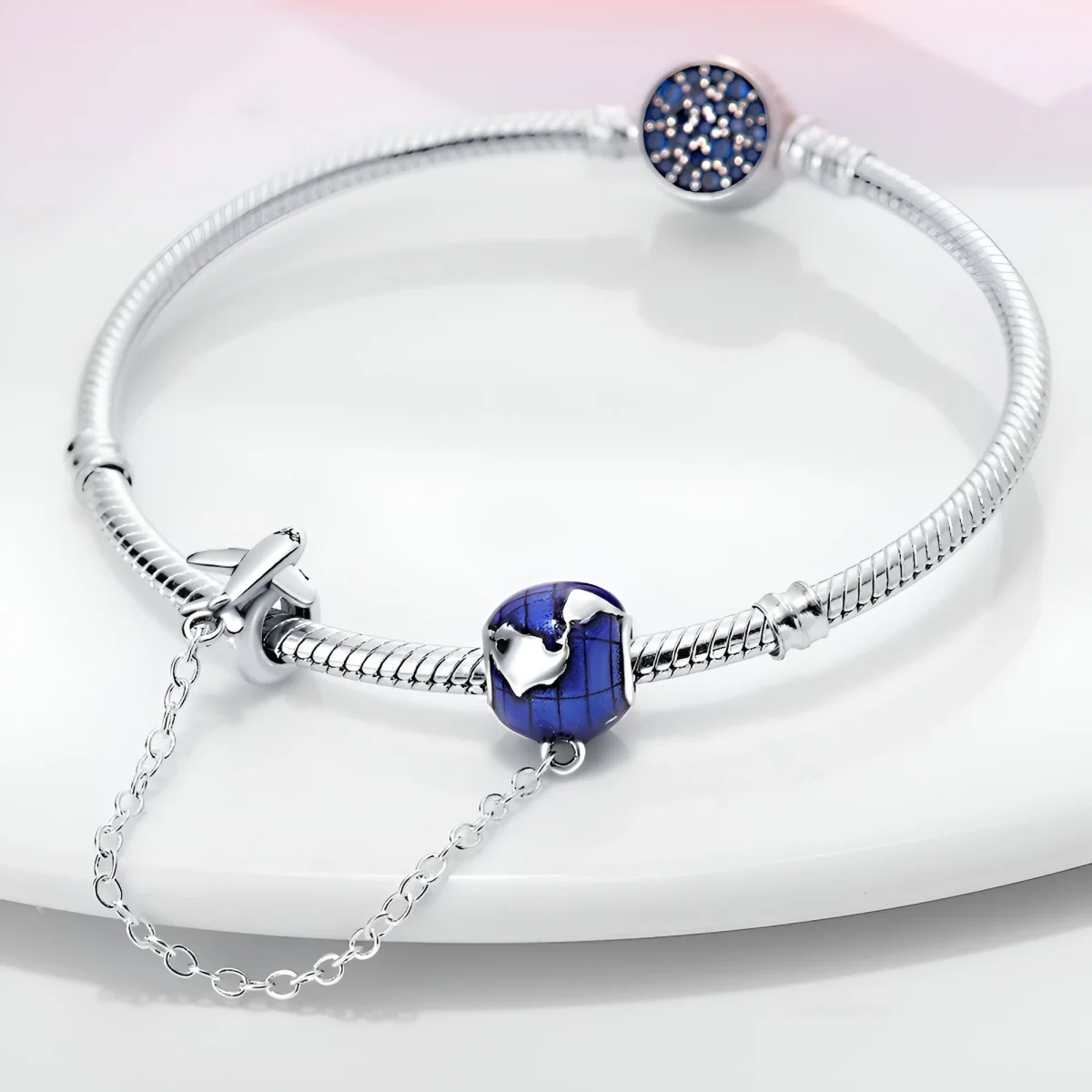 Ce charm se distingue par son design innovant et sa qualité exceptionnelle. Le cuivre plaqué argent assure une durabilité optimale tout en conservant une brillance éclatante. Le globe terrestre, avec ses continents détaillés et son émail bleu profond, et l’avion en argent, apportent une touche de modernité et de raffinement. La chaîne délicate qui relie les deux éléments ajoute une dimension dynamique et élégante, faisant de ce charm un choix parfait pour les passionnés de voyage.