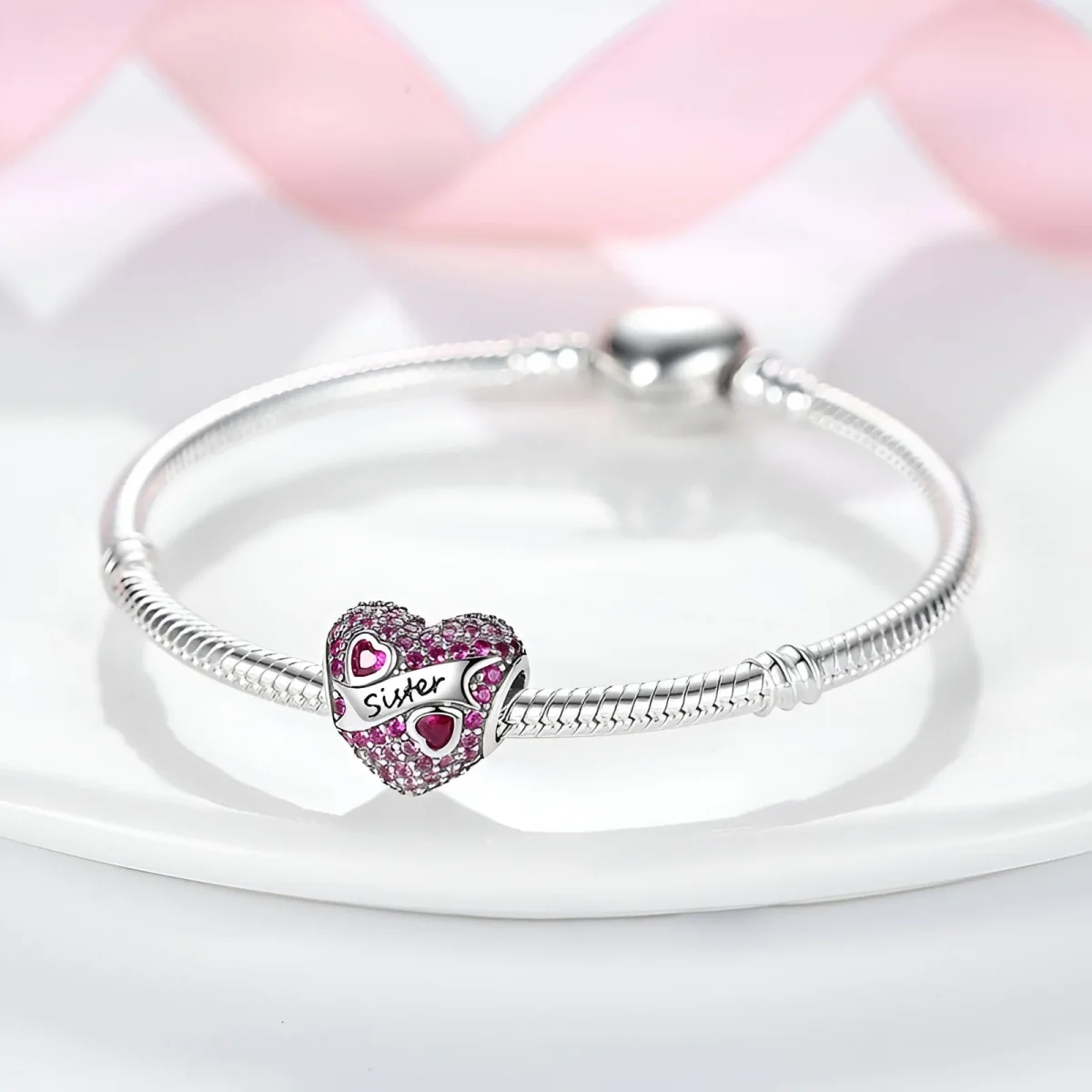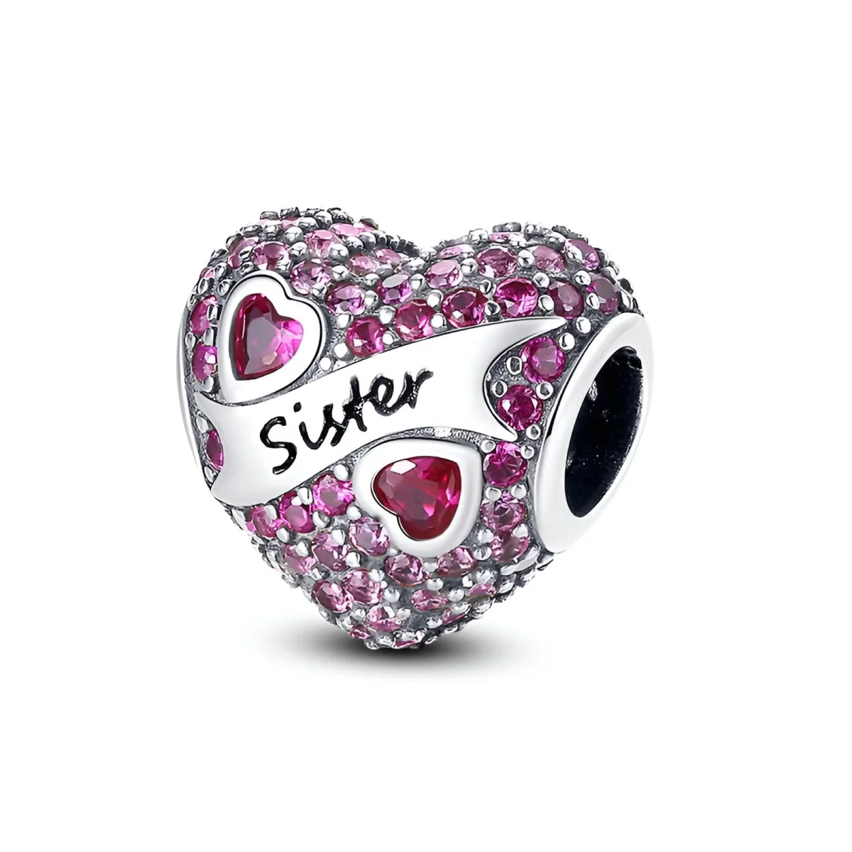 Exprimez votre amour et votre affection pour votre soeur avec ce charm en cuivre plaqué argent en forme de coeur, orné d’oxydes de zirconium roses scintillants. Ce bijou délicat et raffiné est décoré d’une magnifique inscription « Sister » qui traverse le coeur, symbolisant un lien éternel et un amour indéfectible. Les pierres roses, finement serties, ajoutent une touche d’éclat et de féminité, rendant ce charm parfait pour une soeur précieuse.