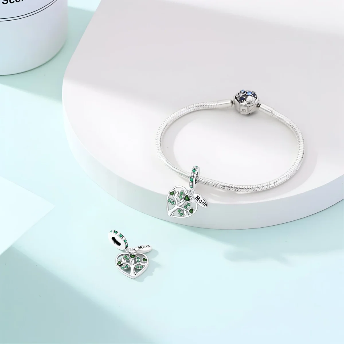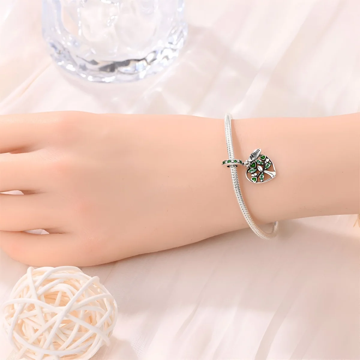 Ce charm se fixe facilement à votre bracelet grâce à son anneau décoré de cœurs et de pierres vertes, ajoutant une note de raffinement et de signification personnelle à votre collection de bijoux. Le cuivre plaqué argent garantit une durabilité exceptionnelle et une apparence luxueuse. Les détails délicats et les finitions brillantes rendent ce charm aussi esthétique que symbolique.