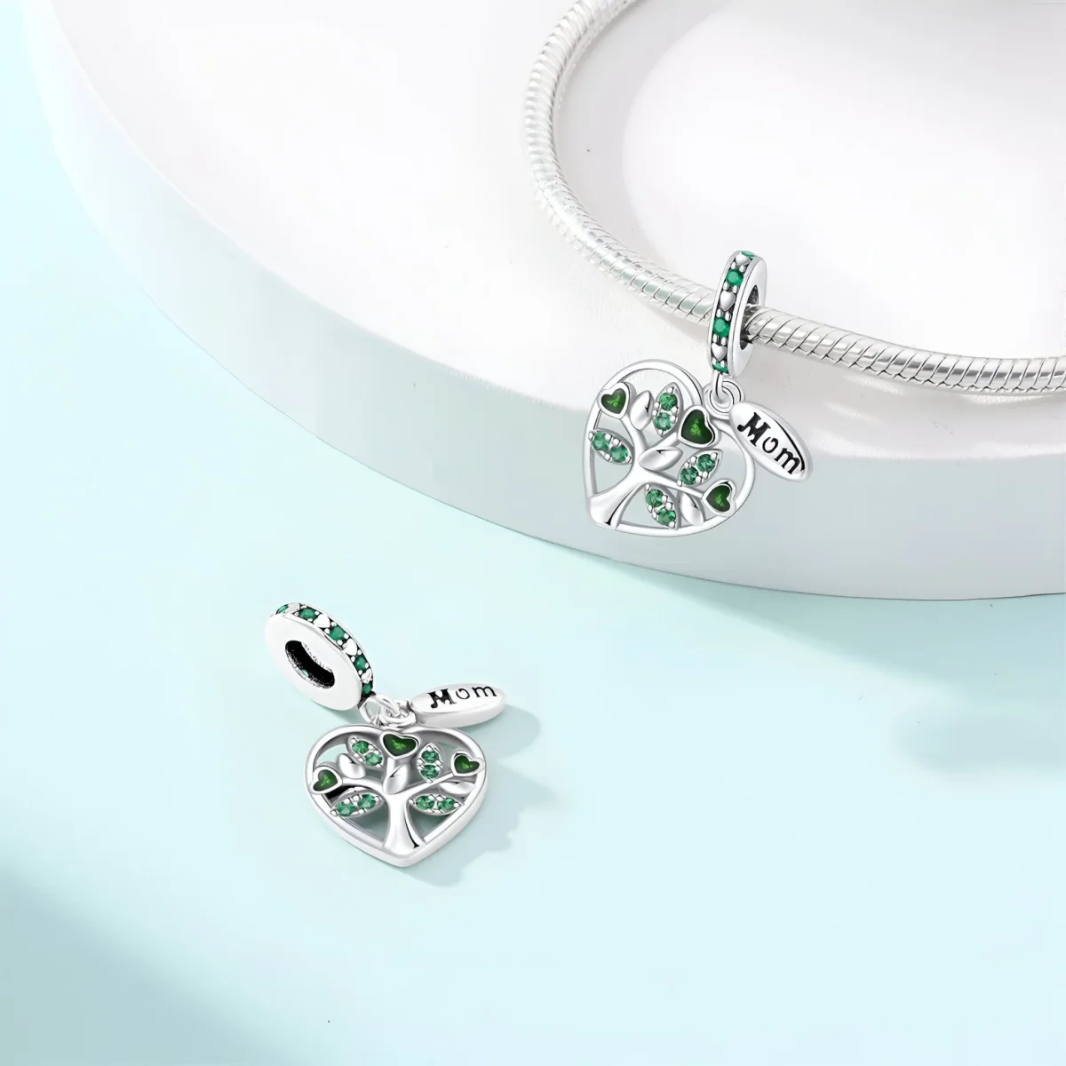 Célébrez l’amour et la connexion familiale avec ce charm en cuivre plaqué argent. Ce charm magnifique représente un cœur abritant un arbre de vie, symbole de force et de croissance, orné de petites pierres vertes scintillantes et de feuilles en forme de cœurs verts. Une petite plaque gravée « Mom » ajoute une touche spéciale et personnelle, faisant de ce bijou un hommage parfait à une mère aimante.