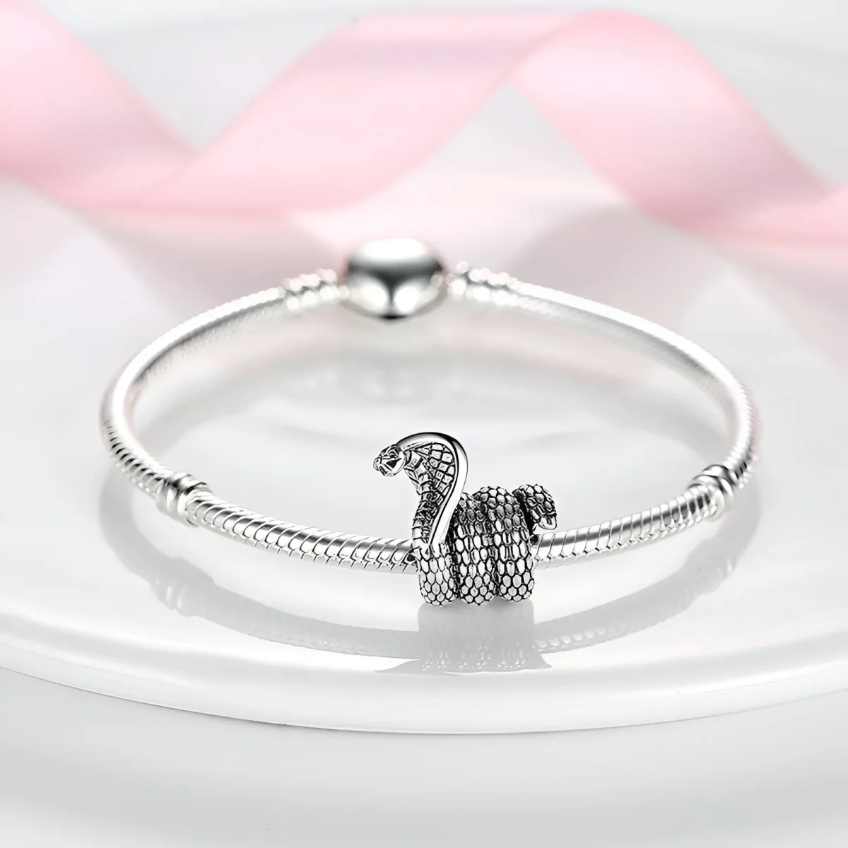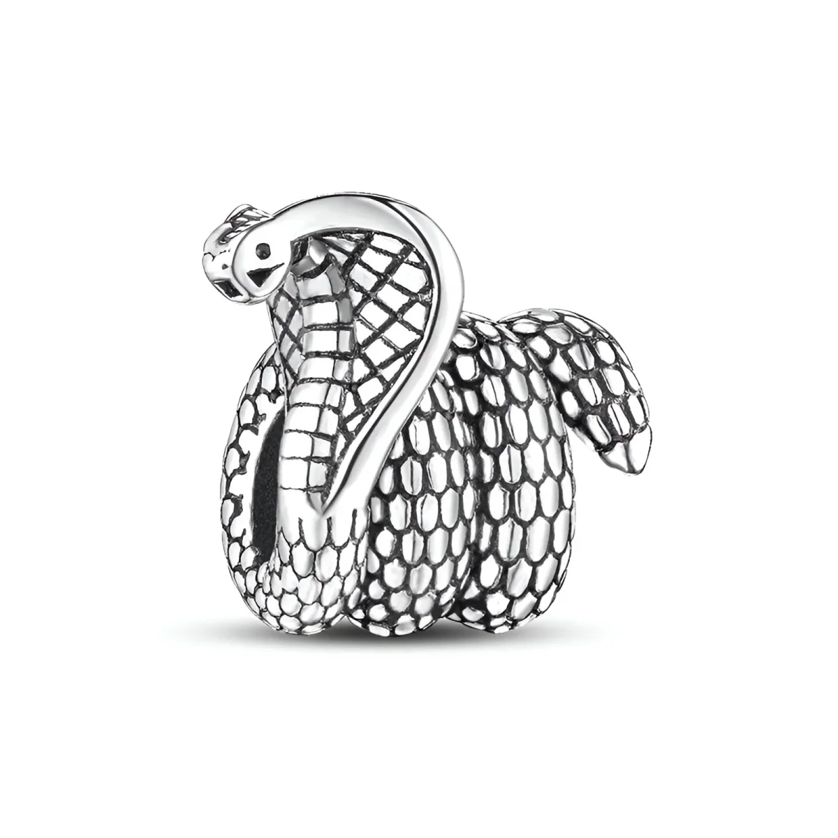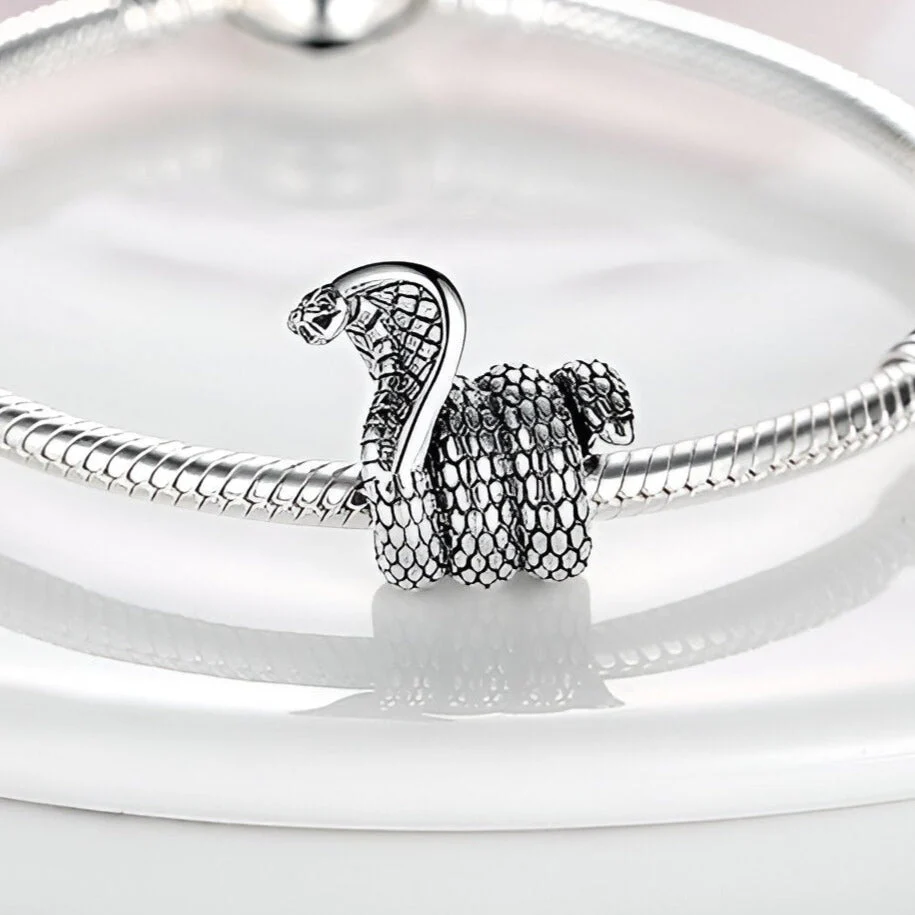 Le cobra, avec ses écailles finement sculptées et son allure imposante, symbolise la puissance et la protection. La finition en argent plaqué met en valeur chaque détail du serpent, créant un effet visuel saisissant qui attire le regard. Le design réaliste capture l’essence de ce reptile fascinant, ajoutant une dimension mystique à ce charm.