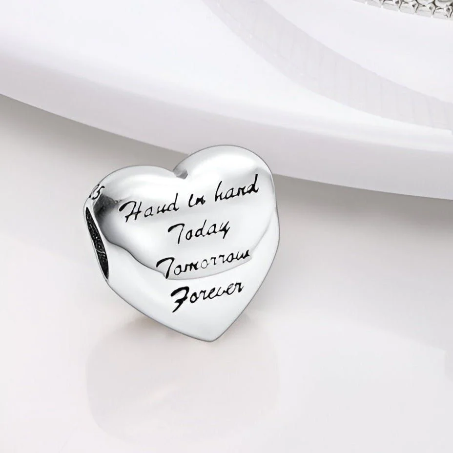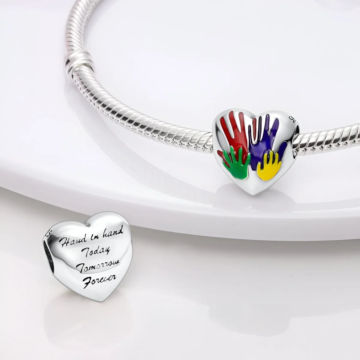 Ce charm se distingue par son magnifique cœur en argent, décoré de quatre mains en émail rouge, bleu, vert et jaune, symbolisant la diversité et l’unité. À l’arrière du cœur, l’inscription « Hand in Hand Today Tomorrow Forever » ajoute une touche personnelle et inspirante, rappelant l’importance des liens durables et de la solidarité. La finition polie et les couleurs vives créent un effet visuel saisissant, ajoutant une touche de charme et de signification à ce bijou.