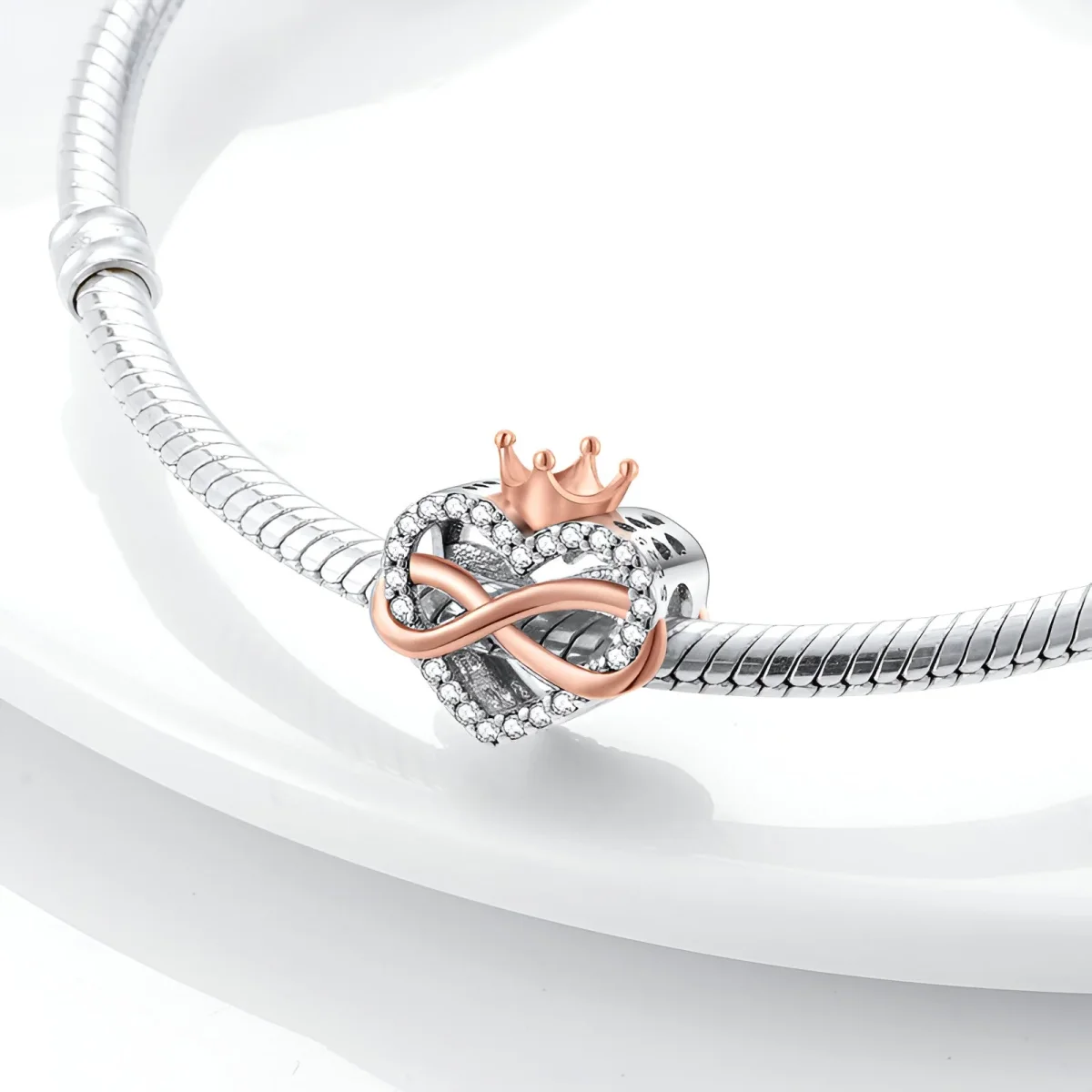 Ce charm se distingue par son magnifique cœur en argent, orné d’une couronne dorée et d’un symbole infini, tous deux sertis de pierres étincelantes. La combinaison harmonieuse de l’argent, de l’or rose et des pierres brillantes crée un effet visuel saisissant, ajoutant une touche de glamour et de sophistication à ce bijou. Chaque détail est finement travaillé pour offrir une pièce unique et pleine de caractère.