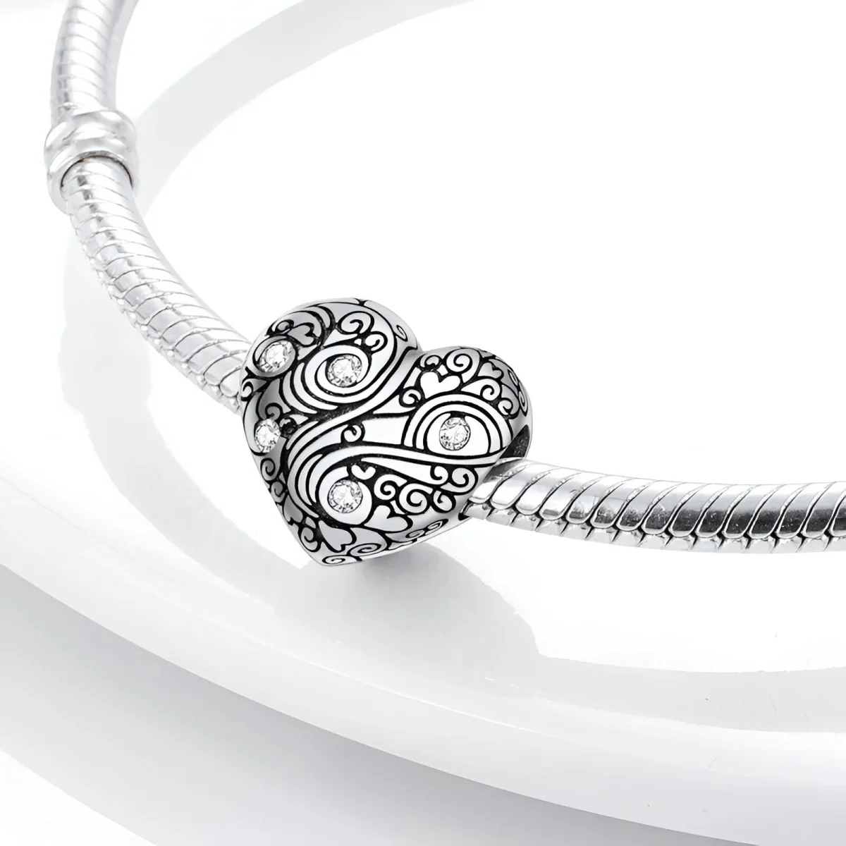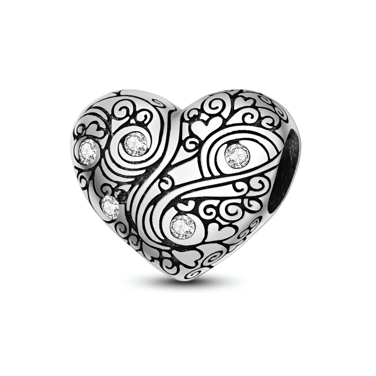 Ce charm se distingue par son magnifique cœur gravé de motifs délicats et entrelacés, créant une texture riche et détaillée. Les pierres d’oxyde de zirconium, minutieusement incrustées dans le cœur, ajoutent une touche de scintillement et de luxe à ce bijou. Chaque détail est finement travaillé pour offrir une pièce unique et pleine de caractère.