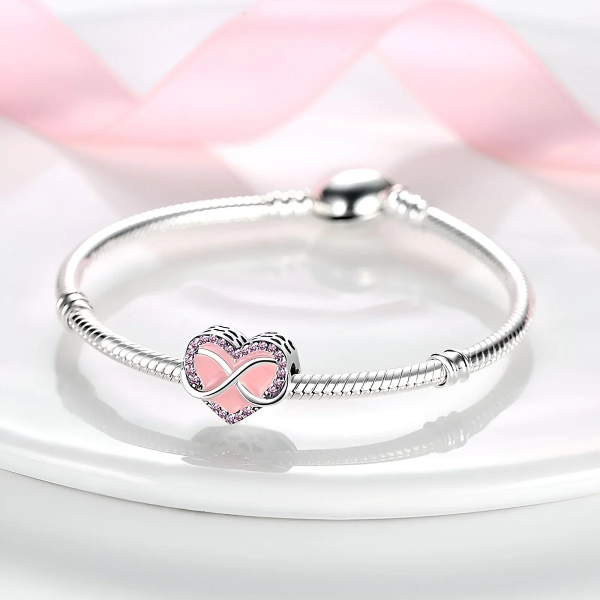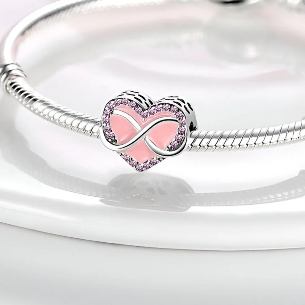 Ce charm se distingue par son magnifique cœur rose émaillé, entouré d’un symbole infini en argent serti de strass violets scintillants. Chaque détail est minutieusement travaillé pour offrir une pièce vibrante et pleine de vie. La combinaison des couleurs douces et des pierres brillantes crée un bijou qui attire immédiatement l’attention et ajoute une note de charme à votre collection.