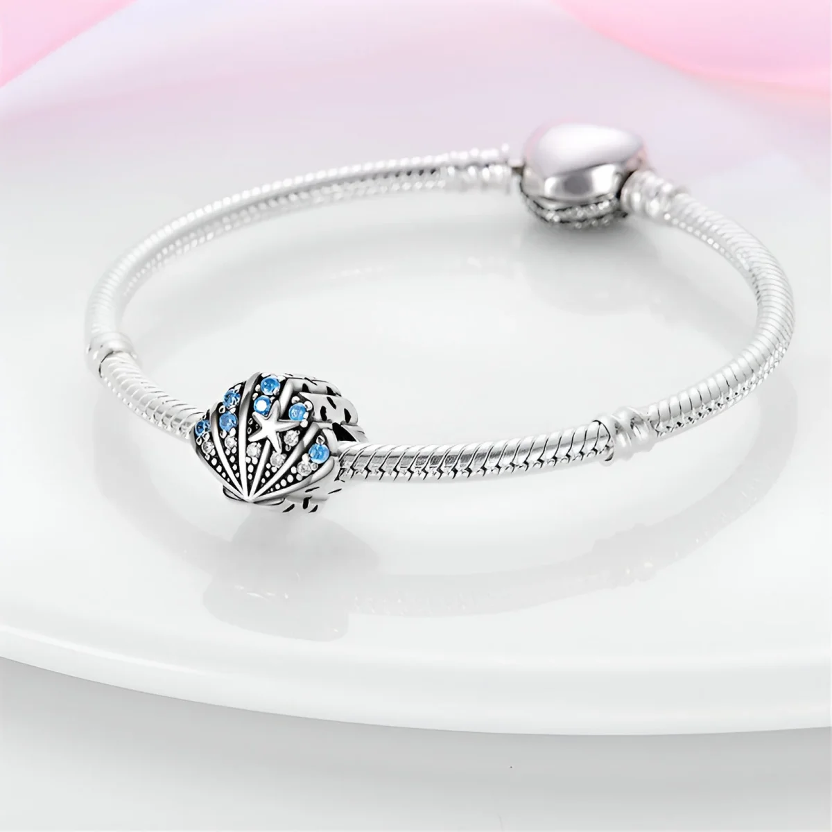Ce charm se distingue par son design soigné et sa qualité exceptionnelle. Le cuivre plaqué argent assure une durabilité optimale tout en conservant une brillance éclatante. Les pierres bleues et claires scintillantes ajoutent une touche de fraîcheur et de raffinement, tandis que l’étoile de mer au centre rehausse l’esthétique marine du charm. Le coquillage, avec ses détails délicats et ses couleurs éclatantes, fait de ce charm un choix parfait pour ceux qui apprécient les bijoux thématiques et élégants.