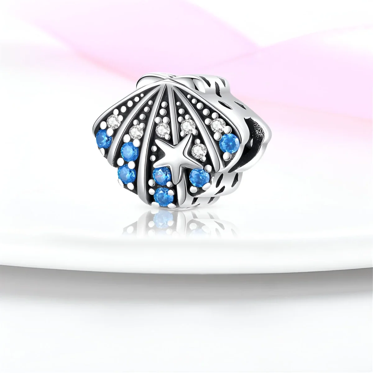 Apportez une touche d’élégance marine à votre bracelet avec le charm coquillage marin en cuivre plaqué argent. Ce charm raffiné capture l’essence de l’océan avec son design en forme de coquillage décoré de pierres bleues étincelantes et d’une étoile de mer au centre. Réalisé en placage argent 925, ce bijou unique est orné de détails minutieux et de petites pierres brillantes, apportant une note lumineuse et sophistiquée à votre collection de charms.