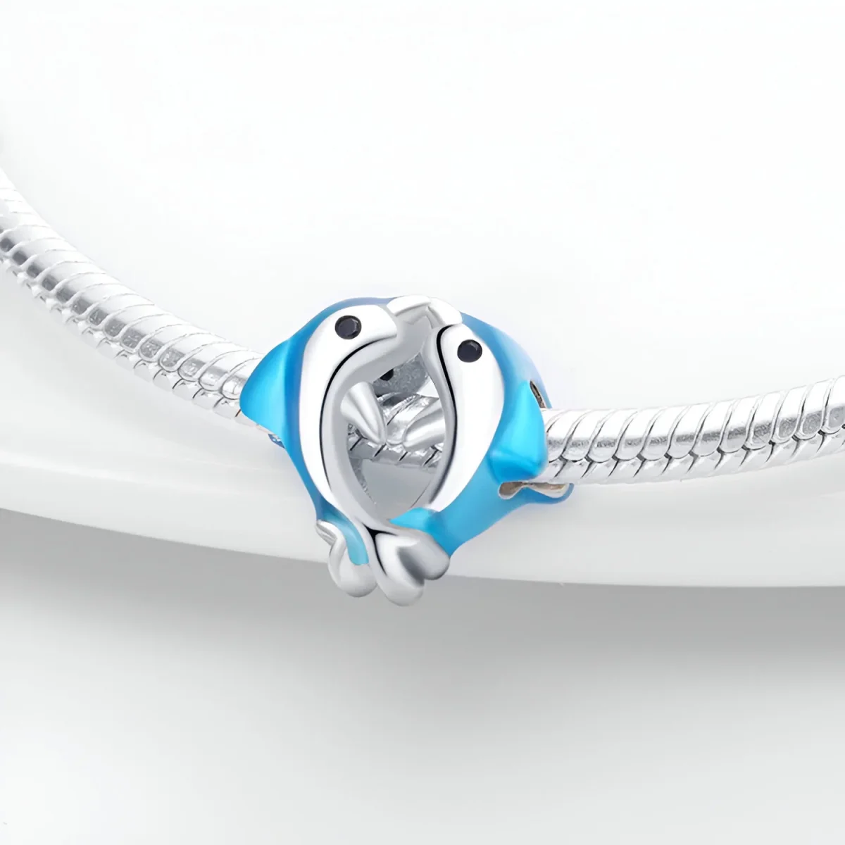 Ce charm se distingue par son design harmonieux et sa qualité supérieure. Le cuivre plaqué argent garantit une durabilité optimale tout en offrant une brillance éclatante. Les détails émaillés, avec leurs nuances bleues et blanches, apportent une touche de fraîcheur et de vivacité. Les deux dauphins, en parfaite symbiose, font de ce charm un choix idéal pour ceux qui recherchent des bijoux symboliques et élégants.