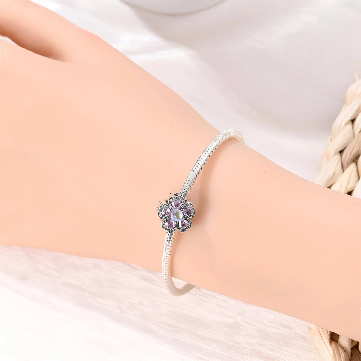 Ce charm se distingue par son magnifique motif floral, chaque pétale étant formé par des pierres d’oxyde de zirconium roses en forme de cœur. Le centre de la fleur est orné d’une pierre opalescente, ajoutant une touche de mystère et de luminosité. Les détails des pétales, sertis de petites pierres scintillantes, créent un effet visuel captivant et élégant.
