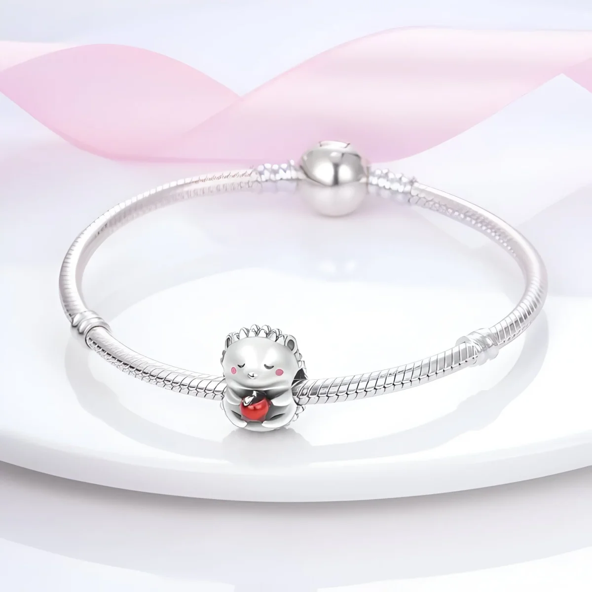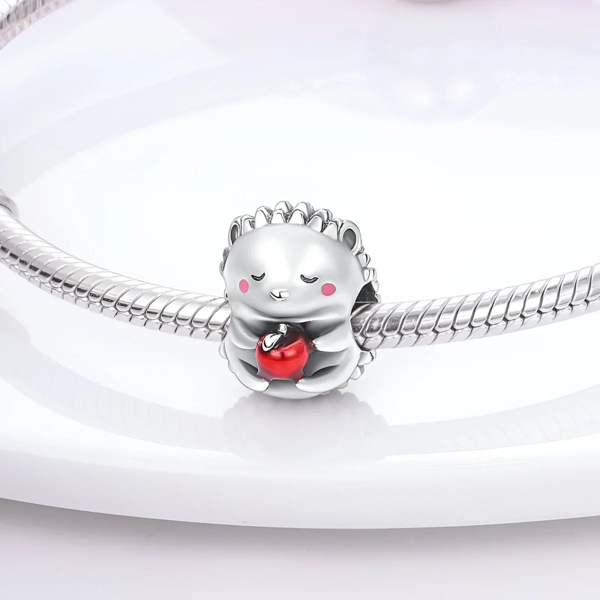 Le charm présente un hérisson au design exquis, capturé dans une pose attendrissante avec ses joues délicatement rosées et ses yeux fermés, évoquant la tranquillité et la sérénité. Entre ses petites pattes, le hérisson tient un cœur rouge vif, symbole d’amour et de tendresse, ajoutant une touche de couleur éclatante à l’ensemble.