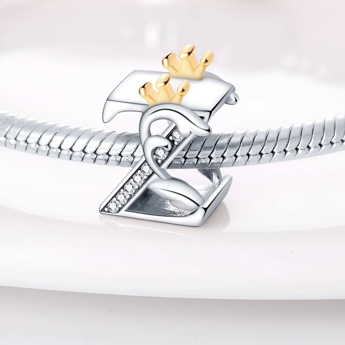 Ce charm en cuivre plaqué argent, délicatement façonné en forme de lettre et surmonté d’une couronne dorée, est une pièce unique qui ajoute une touche de royauté à votre bracelet. Chaque lettre est finement travaillée pour capturer l’élégance et le prestige, rendant ce bijou idéal pour ceux qui souhaitent personnaliser leur collection avec une initiale significative. La couronne dorée, symbolisant la royauté et la distinction, rehausse le design avec une touche de sophistication subtile.
