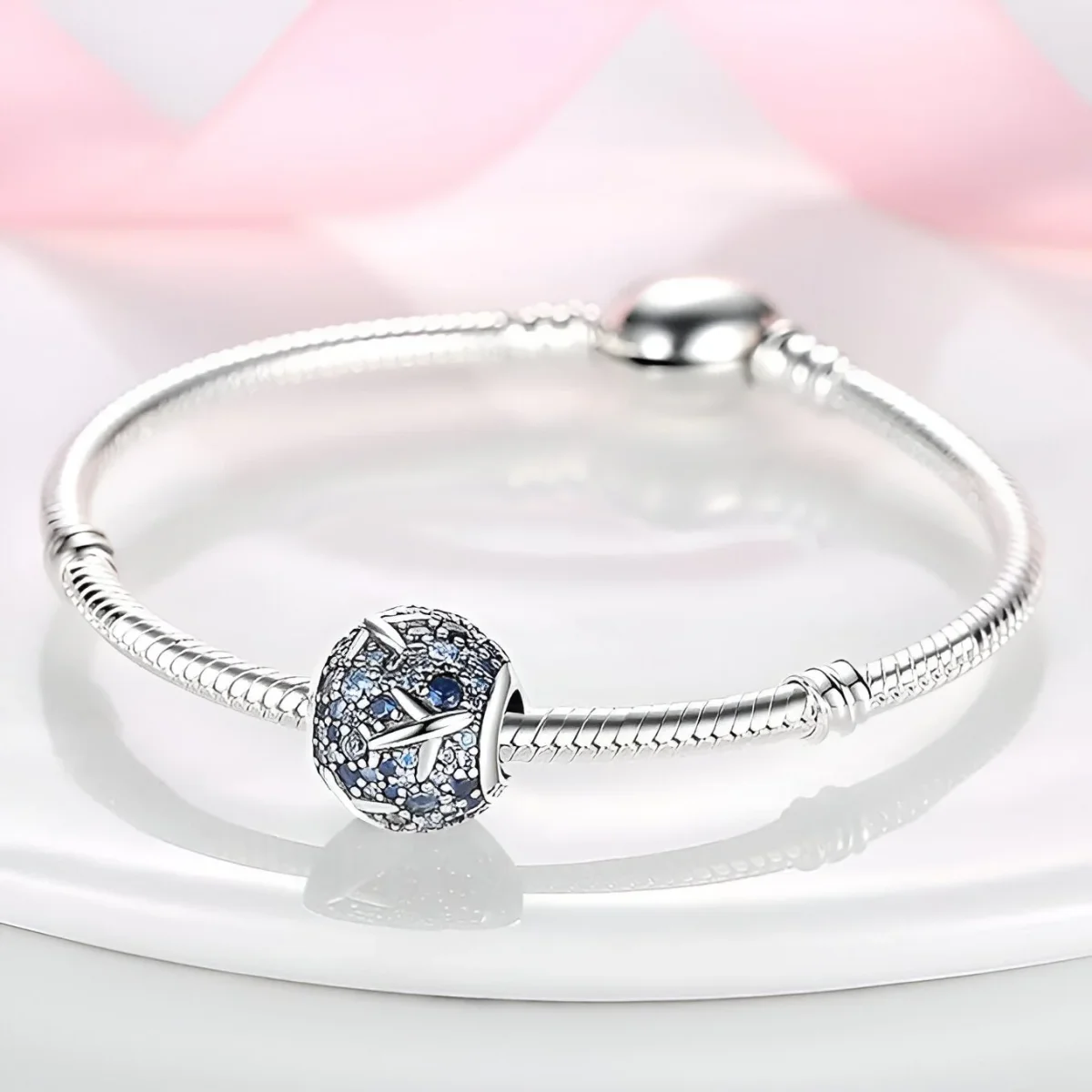 Ce charm captivant se distingue par ses avions élégamment sculptés qui semblent planer au-dessus d’un ciel étoilé, représenté par une multitude d’oxydes de zirconium bleus de différentes teintes. Chaque pierre est minutieusement sertie pour refléter la lumière à chaque mouvement, créant un effet scintillant et envoûtant. La finition en argent poli ajoute une touche de sophistication, faisant de ce charm un ajout incontournable à votre collection.