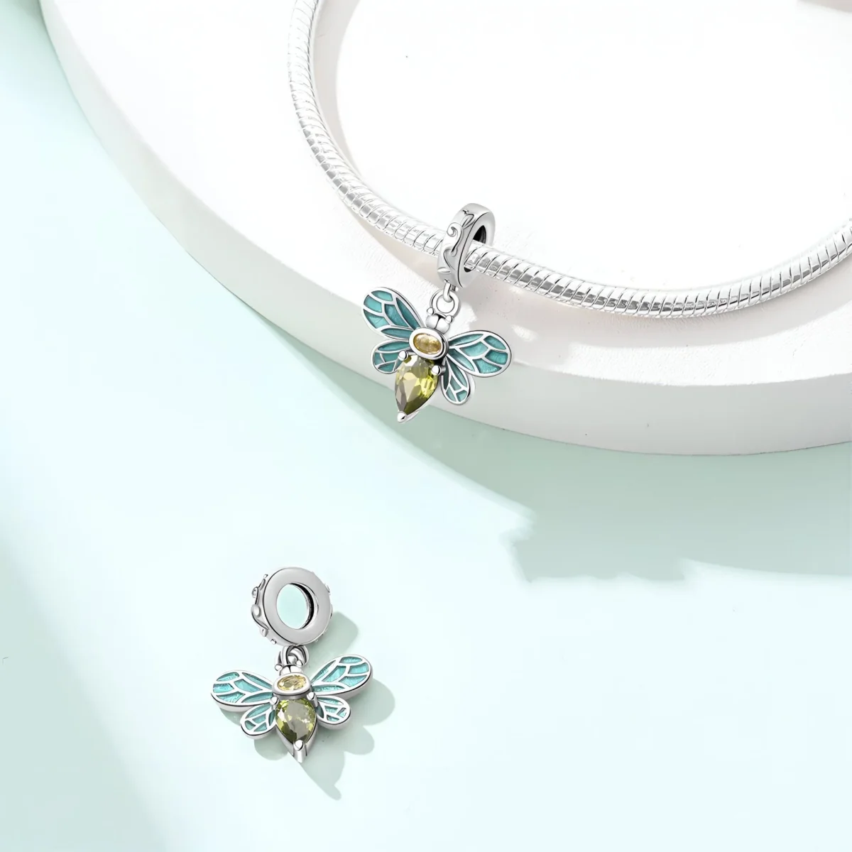 Ce charm se distingue par son magnifique motif d’abeille, chaque aile étant ornée d’émail bleu scintillant, tandis que le corps est décoré de pierres d’oxyde de zirconium jaunes et vertes. Les détails minutieux des ailes et des pierres étincelantes ajoutent une touche de glamour et de sophistication à ce bijou. La finition polie et les couleurs vibrantes confèrent à ce charm une allure unique et pleine de caractère.