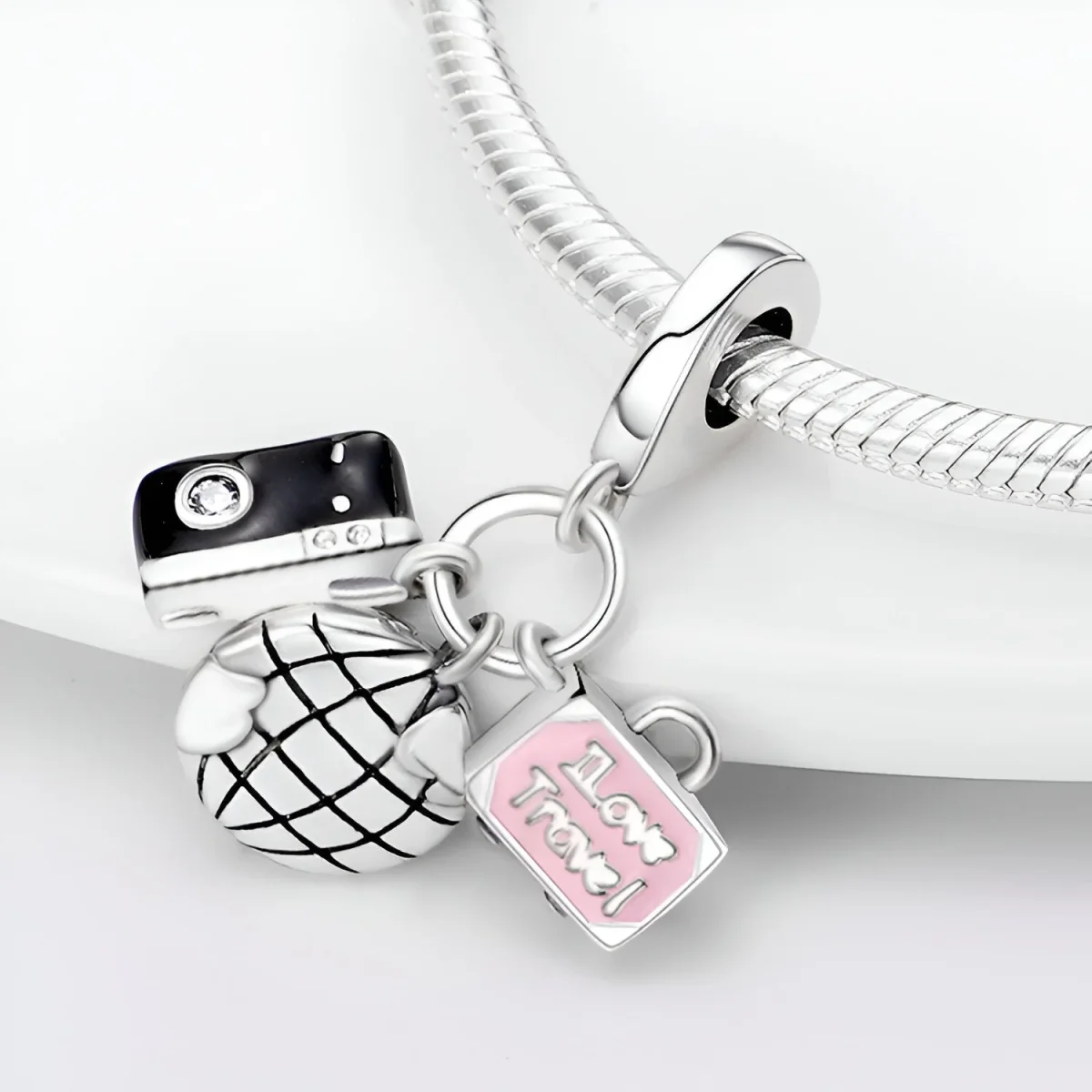 Capturez vos souvenirs de voyage avec ce charm en cuivre plaqué argent, parfait pour les amateurs d’aventure. Ce bijou captivant présente une combinaison de pendentifs représentant un appareil photo élégant, un globe terrestre et une valise rose ornée de l’inscription « I Love Travel », évoquant la joie et l’excitation des voyages. Chaque élément de ce charm est conçu pour célébrer l’esprit d’exploration et de découverte.
