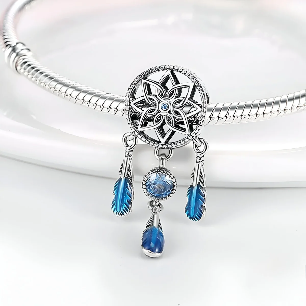 Ce charm se distingue par son magnifique motif d’attrape-rêves, finement ciselé et orné de plumes délicatement émaillées en bleu. Les plumes suspendues bougent gracieusement avec chaque mouvement, ajoutant une dimension dynamique et enchanteresse à ce bijou. Au centre, une pierre bleue scintillante capte la lumière, symbolisant les rêves doux et apaisants. La finition en argent poli confère à ce charm une allure élégante et intemporelle.