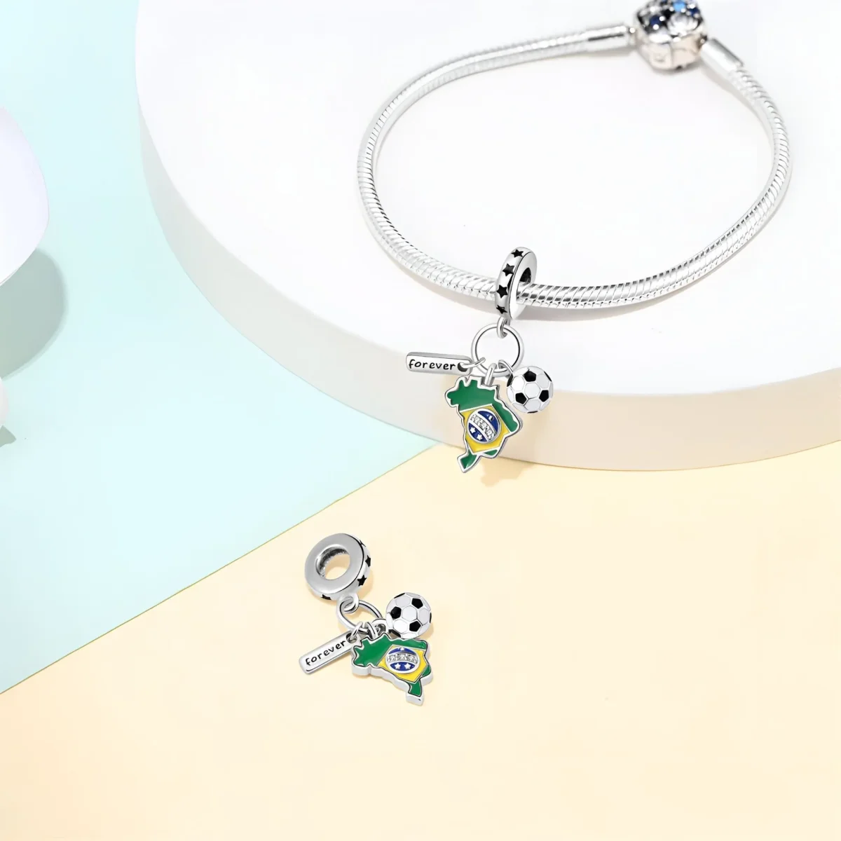 Ce charm accrocheur se fixe aisément à votre bracelet grâce à son anneau orné d’étoiles, ajoutant une touche de caractère à votre collection de bijoux. Le cuivre plaqué argent garantit une durabilité exceptionnelle et une apparence élégante. Les couleurs vives et les finitions brillantes rendent ce charm aussi esthétique qu’évocateur de l’esprit du football brésilien.