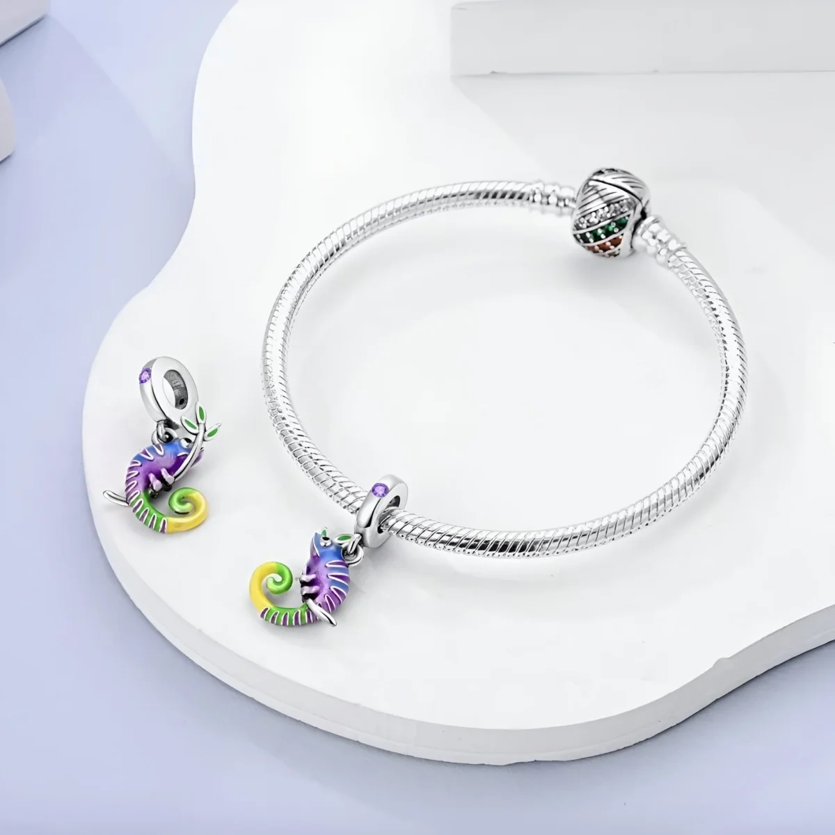 Ce charm se distingue par son design méticuleux et sa qualité exceptionnelle. Le cuivre plaqué argent assure une durabilité optimale tout en conservant une brillance éclatante. Les détails émaillés, avec leurs teintes vives et contrastées, et les pierres scintillantes apportent une touche de glamour et de raffinement. Le caméléon, avec ses couleurs chatoyantes et sa posture dynamique, fait de ce charm un choix parfait pour ceux qui apprécient les bijoux uniques et colorés.