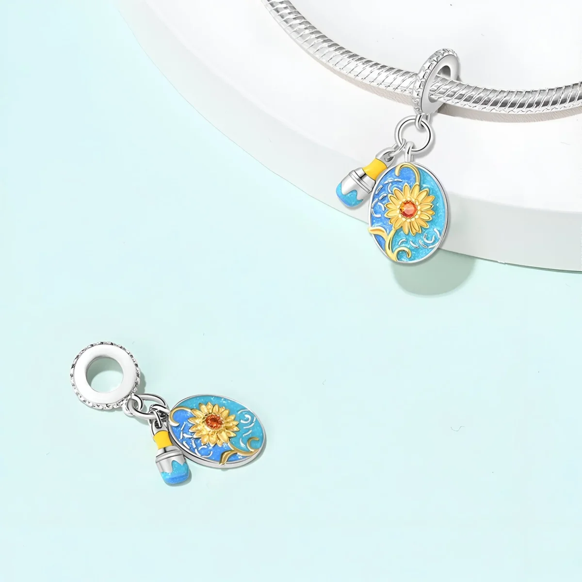 Le tournesol, minutieusement détaillé avec des pétales dorées et un cœur orné d’une pierre d’oxyde de zirconium orange, est le point focal de ce charm. Le fond bleu ciel, parsemé de motifs en argent, capture la beauté et l’intensité du ciel provençal, tel que peint par Van Gogh. Le pinceau, délicatement suspendu, rappelle l’outil essentiel de l’artiste, ajoutant une dimension de créativité et d’inspiration à ce bijou.