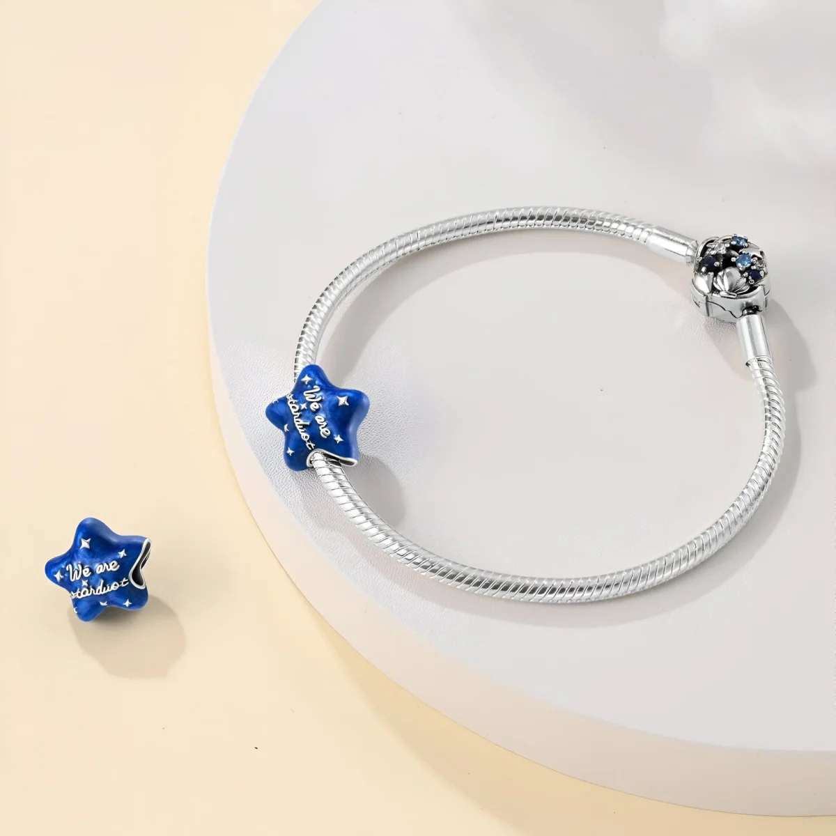 Chaque détail de ce charm a été soigneusement conçu pour capturer l’essence des étoiles. Le fond bleu nuit, illuminé par de délicates étoiles argentées, crée un contraste saisissant qui attire immédiatement le regard. L’inscription « We are stardust », en lettres argentées élégantes, ajoute une touche de profondeur et de réflexion à ce bijou unique. Parfait pour les amateurs d’astronomie et les rêveurs, ce charm est une manière élégante de porter un morceau du ciel à votre poignet.