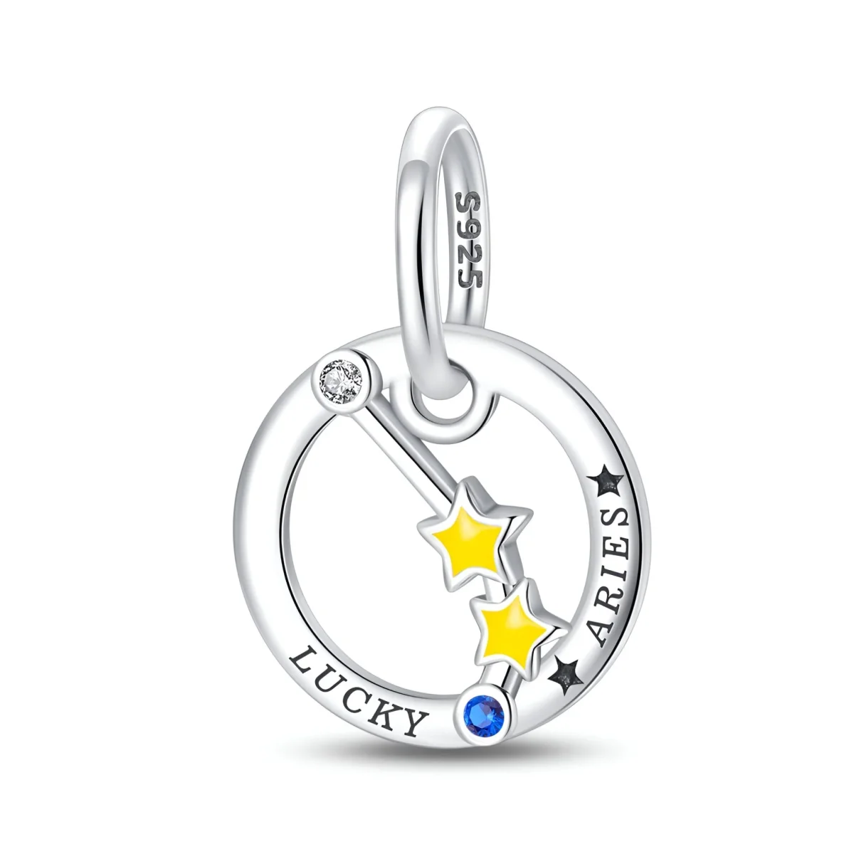 Célébrez votre signe astrologique avec ce charm en argent sterling représentant le Bélier. Ce charm élégant présente la constellation du Bélier, ornée de petites étoiles jaunes qui brillent dans le noir. Chaque détail, de l’anneau circulaire gravé « LUCKY » et « ARIES » aux petites étoiles scintillantes, est soigneusement conçu pour capturer l’essence de ce signe astrologique dynamique et audacieux.