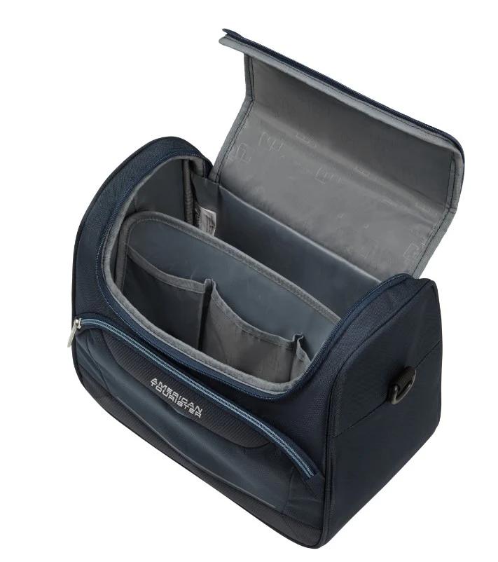 Vanity souple Summerride American Tourister, une belle organisation intérieure, avec une séparation centrale amovible contenant 3 poches, 4 élastiques pour maintenir vos produits, une poche à soufflet sur l’avant, bandoulière réglable amovible et passe trolley sur l’arrière.